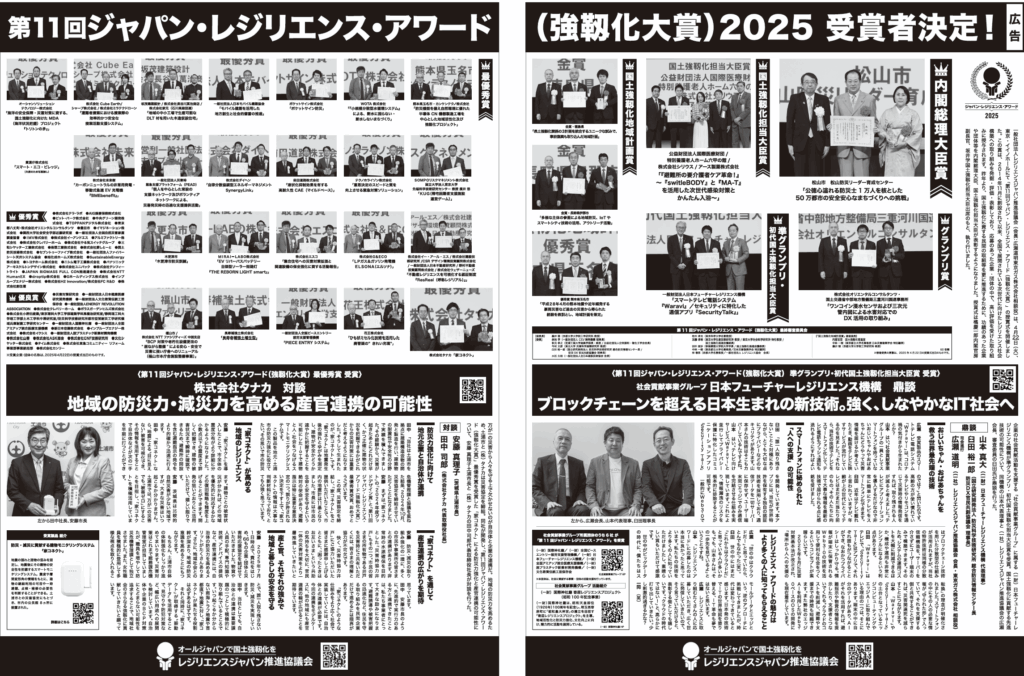 内閣府が進める「国土強靭化」に資する取組みを表彰する「ジャパン・レジリエンス・アワード2025」の授賞記事が、8月27日付け「日本経済新聞社」朝刊にて、見開き2面に亘って掲載されました。初エントリーにも関わらず、災害対応型パーティション「ALCARA アルカラ」が「優秀賞」を受賞したため、グループ会社である「アルミファクトリー株式会社」の社名を掲載頂きました!